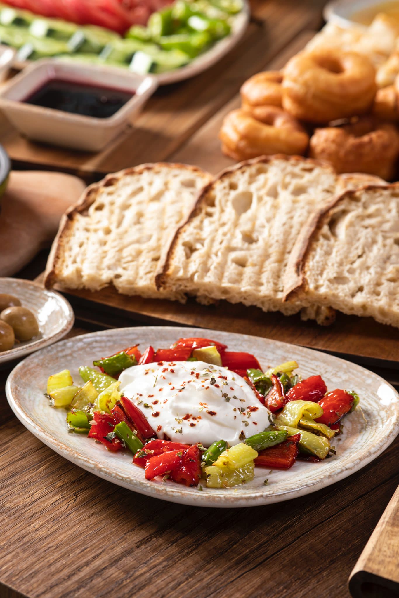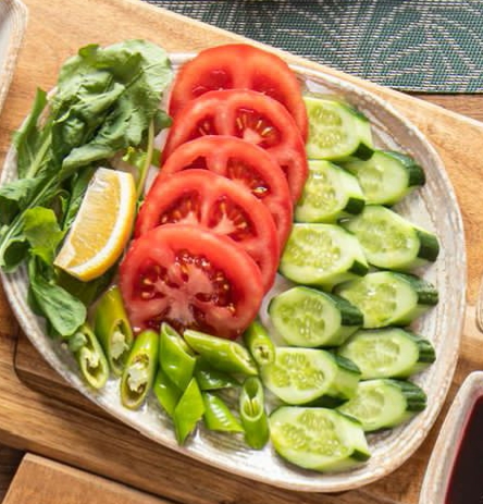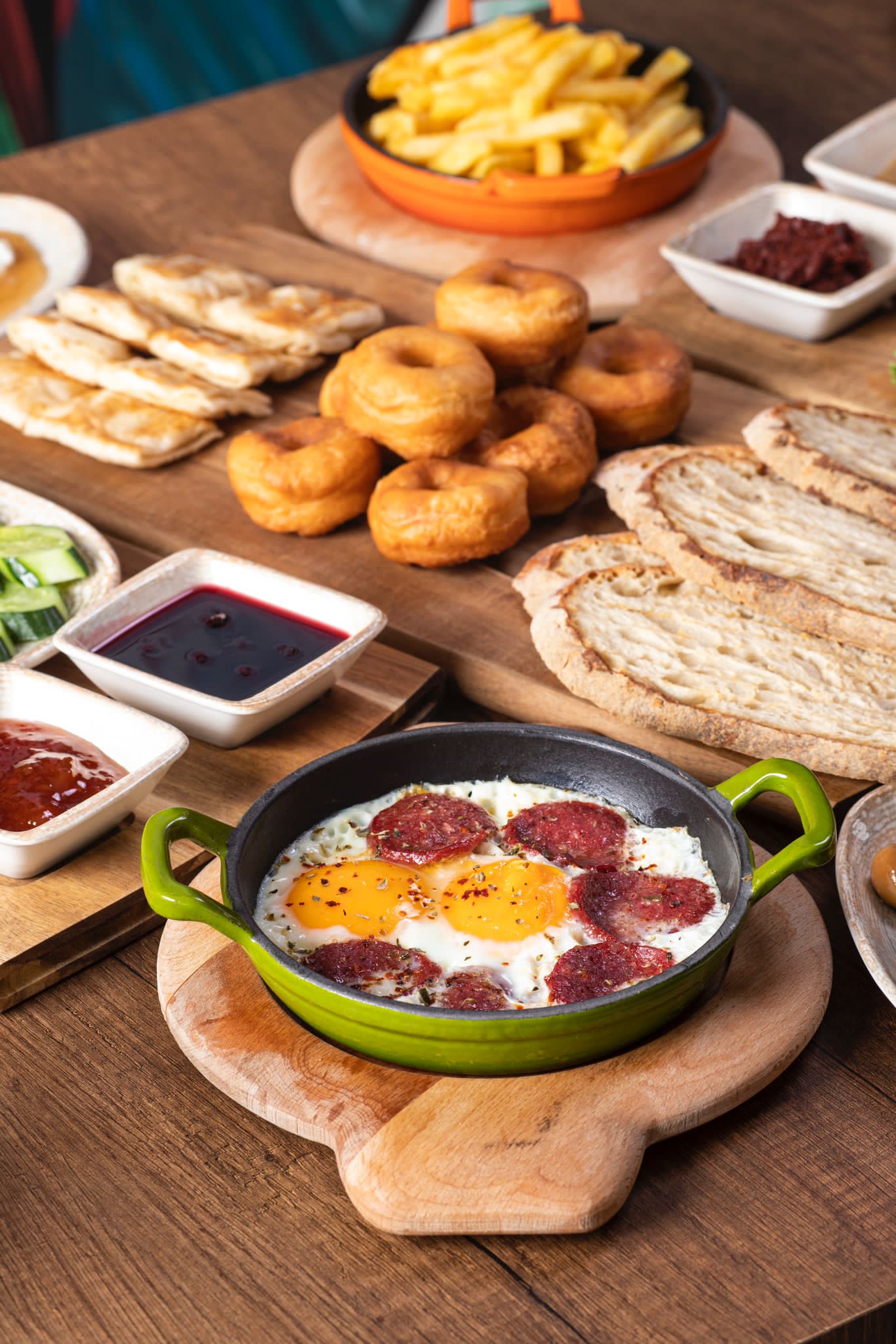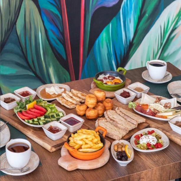 Ezine peyniri, beyaz peynir, kaşar peynir, keçi peyniri, domates, salatalık, sivri biber, roka, limon, mevsim reçelleri (3 çeşit), çikolata, bal, kaymak, tereyağı, çemen, haşhaş, yeşil zeytin, siyah zeytin, pastırma,pişi(rezervasyon ve hafta sonuna özel), kızartma yoğurtlu, patates kızartması, pankek sucuklu yumurta ve sınırsız çay eşliğinde.